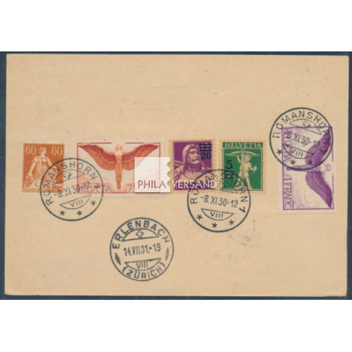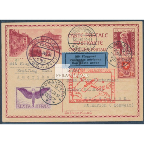 Switzerland DO-X airmail 1931 - ppc with great additional postage sent from Romanshorn 8.XI.30 to Friedrichshafen and forwarded by DO-X airmail via Brasil to Erlenbach in Switzerland (arrival postmark), very good quality and a decorative offer, airmail handbook FF 31.2