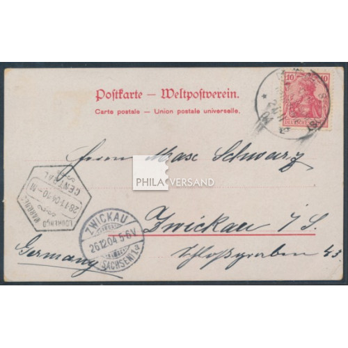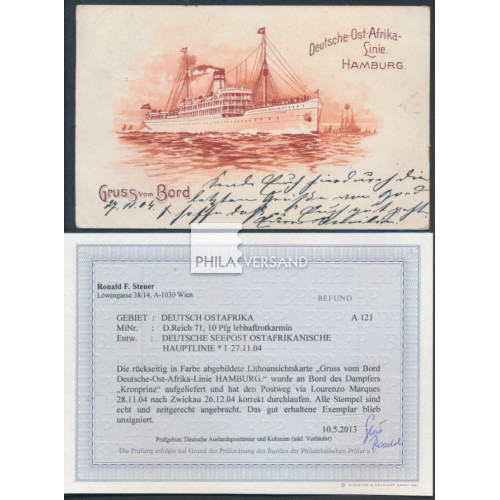 ship mail 1904 - 10 Pfennig Germania with postmark " Deutsche Seepost Ost-Afrikanische Hauptlinie 27/11 04 " with code letter l (steamer Kronprinz) on better ppc with great motif " Gruss vom Bord Deutsche-Ost-Afrika-Linie Hamburg " sent with card text via Lourenco Marquez (transit postmark) to Zwickau (arrival postmark), very good needs quality and with certificate by Steuer, BPP