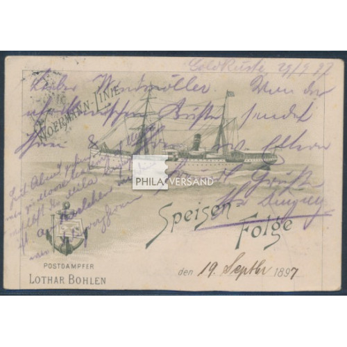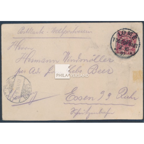 eagle 1897 - 10 Pfennig used as follower in Togo with perfect centric postmark " Lome 2 10 97 " as single postage on rare Litho-ppc (upper part from a menu-card) sent to Essen (arrival postmark), very good needs quality