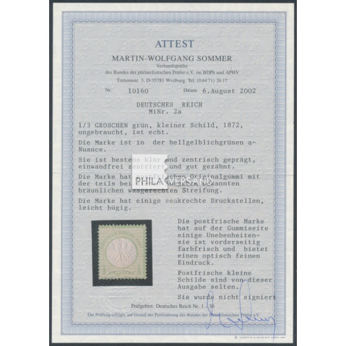 small shield 1872 - 1/3 Groschen stamp in very good mint never hinged quality, backside with normal brownish lines in the gum and with small paper bugs, a very rare stamp with certificate by Sommer, BPP
