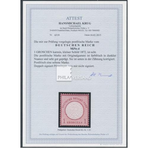 small shield 1872 - 1 Groschen stamp in perfect mint never hinged quality, perforation at the bottom slightly corrected, certificate by Krug, BPP, a rare stamp