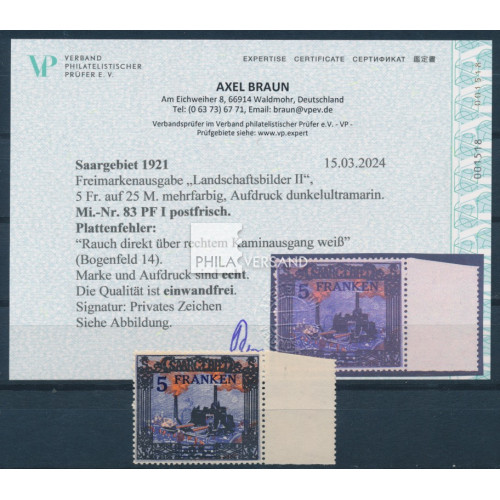 landscapes 1921 - 5 Franken on 25 Mark with plate variety " white smoke directly on chimney ", perfect mint never hinged quality and with certificate by Braun, VPEV