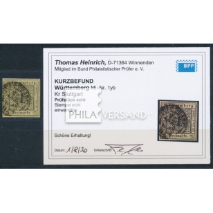 numeral 1851 - 1 Kreuzer stamp on silky paper in perfect used quality and with certificate by Heinrich, BPP