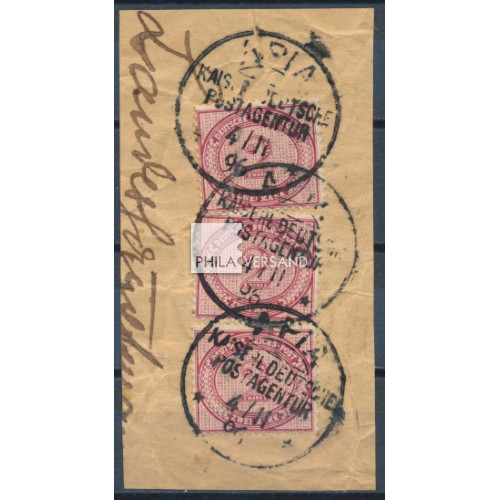 numeral 1896 - 2 Mark in a rare multiple franking of three copies on small piece (maybe from a large format-letter), very clean cancelled " Apia Kaiserl. Deutsche Postagentur 4/11 96 " and used as a forerunner in Samoa. Due to the form of dispatch and the high franking of 6 Marks, the transport folds present in the piece and also in the stamps are considered normal and not as a defect. Backside all stamps are expertized by Steuer, BPP