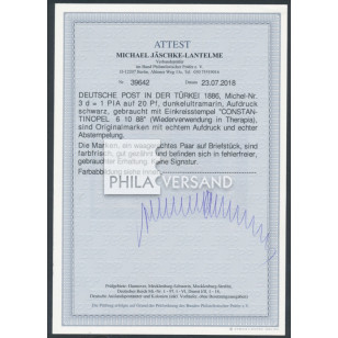 PFENNIG + imprint 1888 - 1 Piaster stamp in a horizontal pair on small piece with very rare in Therapia used postmark from Constantinople, with certificate by Jäschke-Lantelme, BPP