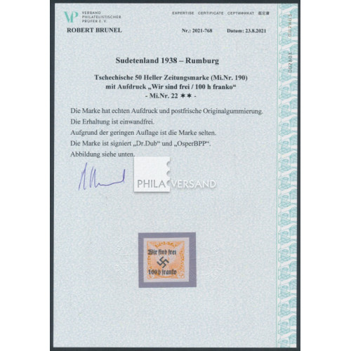 overprint 1938 - 100 h on 50 h newspaper stamp in perfect mint never hinged quality and with certificate by Brunel, VPEV