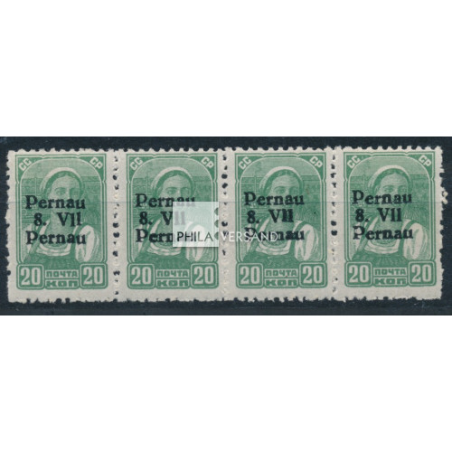 overprint 1941 - local Pernau overprint on 20 Kopecks farmers girl in rare overprint type IV (Pernau in 1st and 3rd overprint row) on strip of four stamps from sheet fields 95-98, the outside two stamps are hinged, the other two stamps are in perfect mint never hinged quality, rare offer