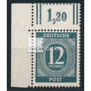 Ziffer 1946 - 12 Pfennig, einwandfrei postfrisch aus der Bogenecke, bessere Farbe, Walzendruck Oberrand, geprüft ARGE