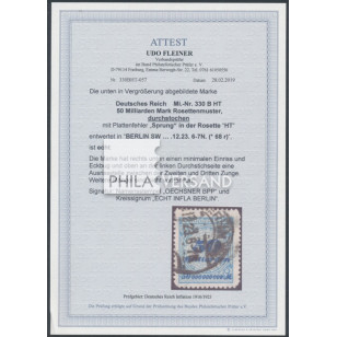 Korbdeckelmuster 1923 - 50 Milliarden durchstochen und mit sehr seltenem Plattenfehler HT (Sprung in der Rosette), sauber gestempelt und mit Attest Fleiner, BPP