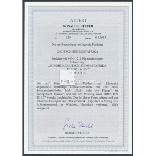 Yacht 1906 - 5 Pfennig ohne Wasserzeichen und perfekt gestempelt " Windhuk 22.12.06 " als Einzelfrankatur auf seltener Litho-Ansichtskarte mit tollem Motiv " Schutztruppen-Lied Stolz weht die Flagge " gesendet nach Dresden (Ankunftstempel), ausgezeichnete Erhaltung und mit Attest Steuer, BPP