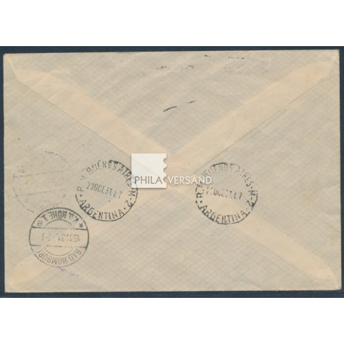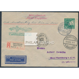 Südamerikafahrt 1931 als toller eingeschriebener Brief dre dritten Fahrt 1931 (Einschreiben waren zu dieser Fahrt erstmalig zugelassen) mit besserer Zuleitung aus den Niederlanden und mit schöner Einzelfrankatur, befördert ab Friedrichshafen mit Luftschiff via Brasilien nach Buenos Aires (rückseitig Ankunftstempel), von dort dann an den Empfänger in Bad Homburg (ebenfalls rückseitig Ankunftstempel), sehr gute Erhaltung und in dieser Form nicht häufig, Sieger 133 o NL, Michel Zeppelin Spezial-Katalog 229 a NL