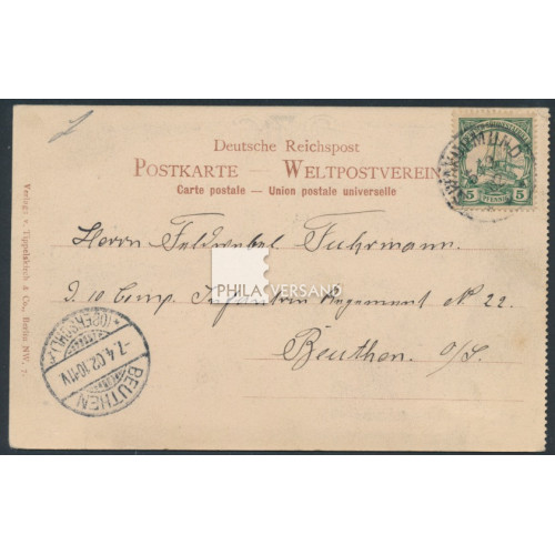 Yacht 1902 - 5 Pfennig als Einzelfrankatur und sehr gut gestempelt " Swakopmund 5/3 02 " auf wunderbarer Litho-Ansichtskarte mit tollem Motiv " Gruss aus Deutsch Südwest-Afrika " mit drei Einzelbildern geschrieben in Richthofen und gesendet mit Kartentext nach Beuthen (Ankunftstempel), sehr gute Bedarfserhaltung
