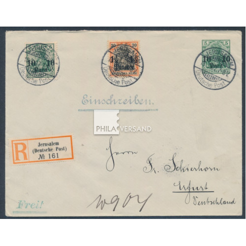 Germania 1907 - 10 Para Germania in Aufdrucktype III als Wertstempel auf Ganzsachenumschlag mit 10 Para und 1 1/2 Piaster Germania, beide Werte mit Wasserzeichen als portogerechte Mischfrankatur, alle Werte perfekt und nahezu zentrisch mit immer gesuchtem Schweizerstempel " Jerusalem 18.3.07 " mit Stundenangabe !! gesendet per Einschreiben mit vierseitig gezähntem Einschreibezettel (Einfeldt Nr. 4) nach Erfurt (rückseitig Ankunftstempel), sehr gute Bedarfserhaltung