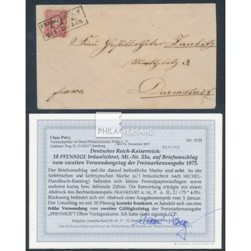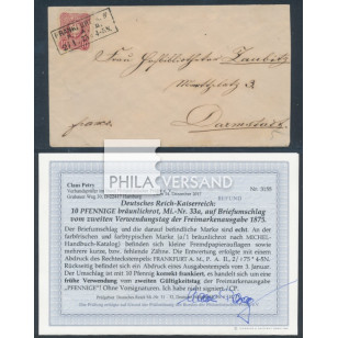 PFENNIGE 1875 - 10 PFENNIGE als Einzelfrankatur in sehr früher Verwendung vom zweiten Gültigkeitstag auf Briefkuvert gestempelt " Frankfurt A.M. 2/1 75 " gesendet nach Darmstadt, gute Bedarfserhaltung und mit Befund Petry, BPP