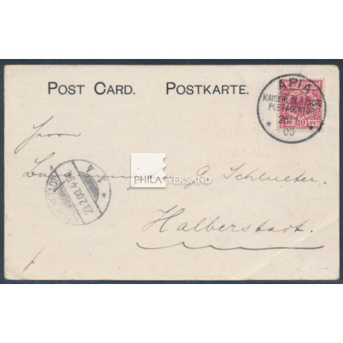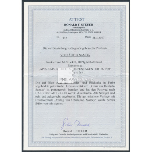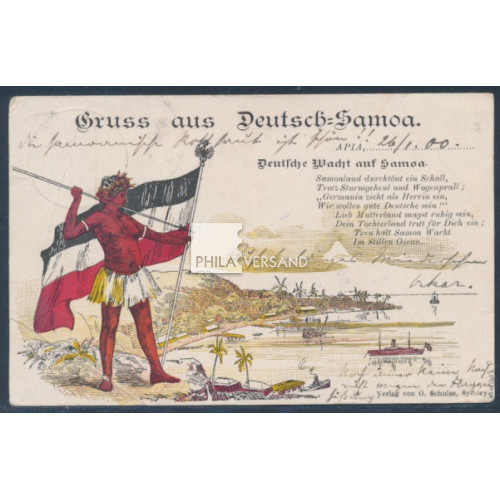 Adler 1900 - wunderbare Litho-Ansichtskarte mit patriotischem Motiv " Gruß aus Deutsch-Samoa " frankiert mit 10 Pfennig Adler und wunderbar entwertet " Apia 26 1 00 " und somit verwendet als Vorläufer in Samoa gesendet mit Kartentext nach Halberstadt (Ankunftstempel), Karte mit üblichen Beförderungsspuren, im übrigen gute Gesamterhaltung und mit Attest Steuer, BPP
