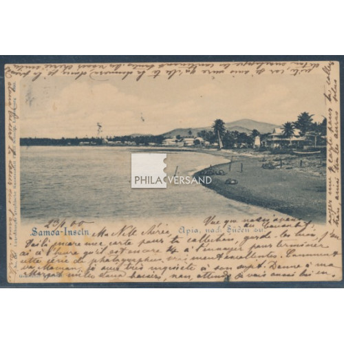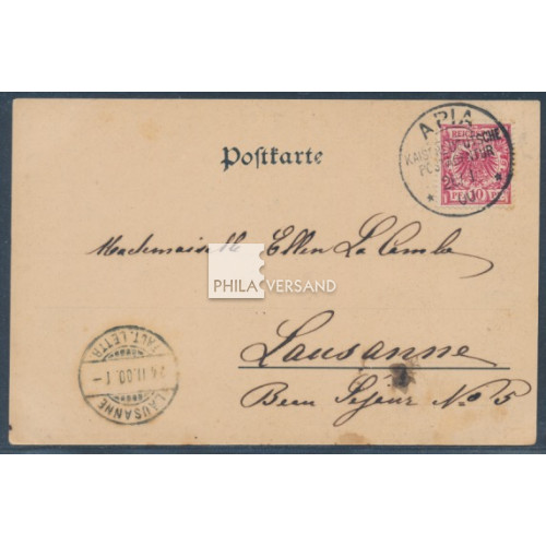 Adler 1900 - Ansichtskarte mit tollem Motiv von den Samoa-Inseln " Apia, nach Süden zu " frankiert mit 10 Pfennig Adler und ausgezeichnet lesbar entwertet " Apia 26 1 00 " und somit verwendet als Vorläufer in Samoa gesendet mit Kartentext nach Lausanne in der Schweiz (Ankunftstempel), ausgezeichnete Erhaltung und nahezu völlig ohne die sonst üblichen Beförderungsspuren