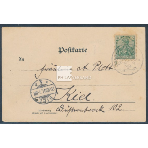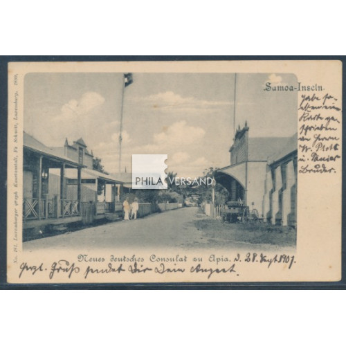 Reichspost 1901 - Ansichtskarte mit tollem Motiv von den Samoa-Inseln " Neues deutsches Consulat zu Apia " frankiert mit 5 Pfennig Reichspost und lesbar entwertet " Kais. Deutsche Marine Schiffspost No. 8 30 9 00 " (SMS Cormoran) gesendet mit Kartentext nach Kiel (Ankunftstempel), sehr gute Bedarfserhaltung und nahezu völlig ohne die sonst üblichen Beförderungsspuren