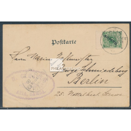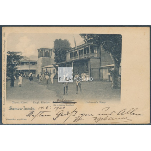Krone 1900 - Ansichtskarte mit seltenem Motiv von den Samoa-Inseln " Tivoli-Hotel; Engl. Kirche; Gebauer (in weißem Kostüm, handschriftlich geändert!!) sowie Gebauer's Haus ", frankiert mit 5 Pfennig Krone mit Aufdruck Samoa (Marke oben mit Steg) und gut lesbar entwertet " Apia 14 6 00 " und mit Absenderstempel " H. Gebauer Apia, Samoa" gesendet mit kurzem Grußtext und unterzeichent von H Gebauer nach Berlin (Ankunftstempel), historisch als social philately hochinteressant und in sehr guter Erhaltung