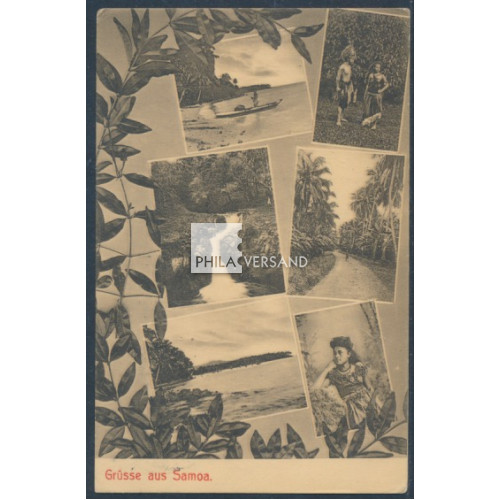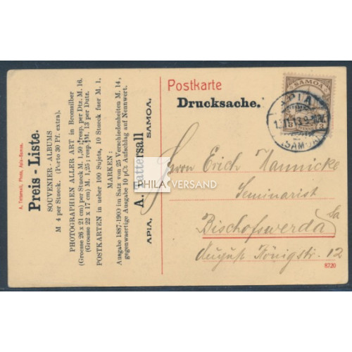 Yacht 1913 - Werbe-Ansichtskarte der bekannten Firma Tattersall mit tollen Einzelmotiven von Ansichtskarte aus dem Hause Tattersall " Grüsse aus Samoa ", frankiert mit 3 Pfennig Yacht und sehr gut lesbar entwertet " Apia 13.11.13 " gesendet nach Bischofswerda, Karte in ausgezeichneter Erhaltung und nahezu völlig ohne die sonst üblichen Beförderungsspuren