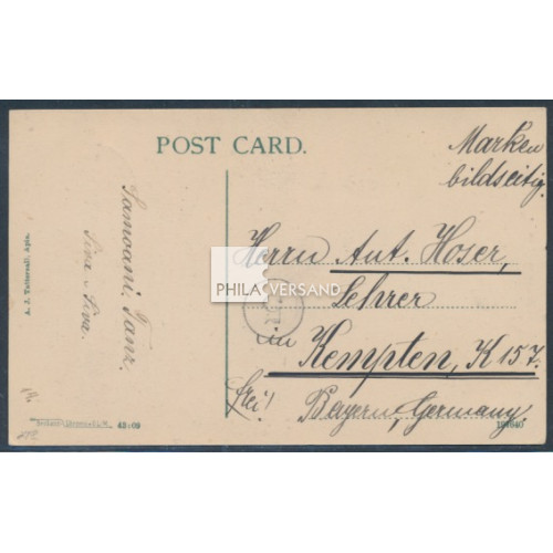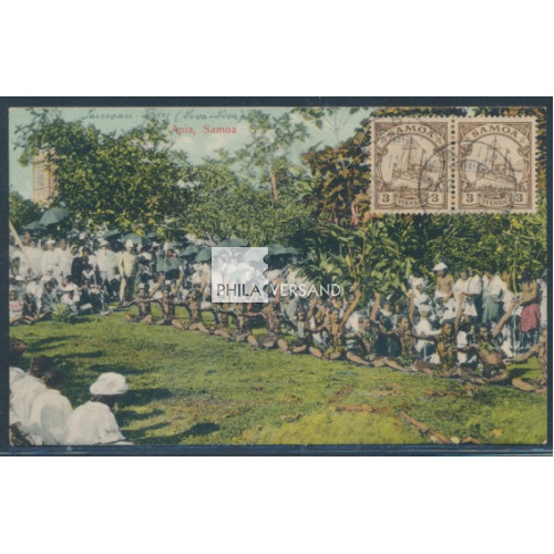 Yacht 1911 - farbige Litho-Ansichtskarte aus Apia, Samoa mit handschriftlicher Erläuterung " Samoan-Tanz (Siva-Siva) " bildseitig frankiert mit waagerechtem Paar 3 Pfennig Yacht und sehr gut lesbar entwertet " Apia 27.2.11 " gesendet nach Kempten, Karte in ausgezeichneter Erhaltung und nahezu völlig ohne die sonst üblichen Beförderungsspuren
