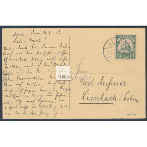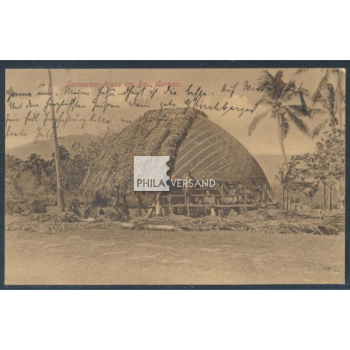 Yacht 1913 - Ansichtskarte mit nicht häufigem Motiv " Samoaner-Haus im Bau, Samoa " frankiert mit 5 Pfennig Yacht und sehr gut lesbar entwertet " Apia 13.2.13 " gesendet mit viel Kartentext nach Limbach, Karte in ausgezeichneter Erhaltung und nahezu völlig ohne die sonst üblichen Beförderungsspuren