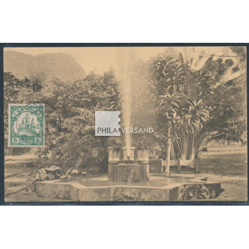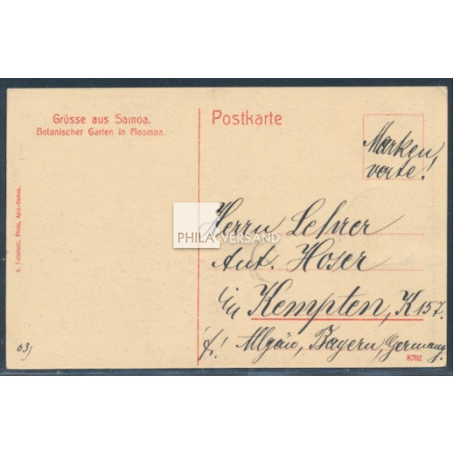 Yacht 1912?? - Ansichtskarte mit gutem Motiv " Grüsse aus Samoa. Botanischer Garten in Moamoa " bildseitig frankiert mit 5 Pfennig Yacht und zart entwertet " Apia ??.6.12?? " gesendet nach Kempten, Karte in ausgezeichneter Erhaltung und nahezu völlig ohne die sonst üblichen Beförderungsspuren