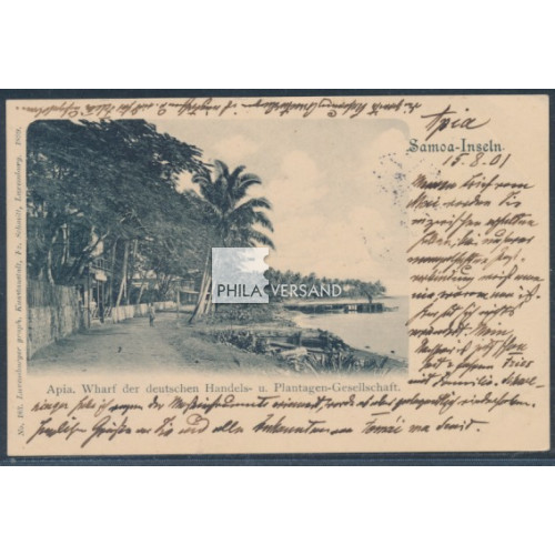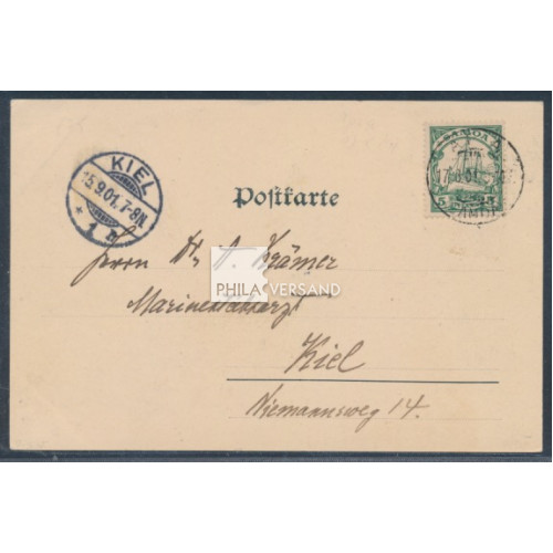 Yacht 1901 - Ansichtskarte mit besserem Motiv " Apia. Wharf der deutschen Handels- u. Plantagen-Gesellschaft " frankiert mit 5 Pfennig Yacht und sehr gut zentrisch entwertet " Apia 17.8.01 " gesendet mit Kartentext nach Kiel (Ankunftstempel), Karte mit geringen Eckbügen, ansonsten in ausgezeichneter Erhaltung und nahezu völlig ohne die sonst üblichen Beförderungsspuren