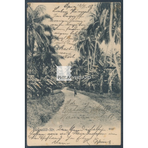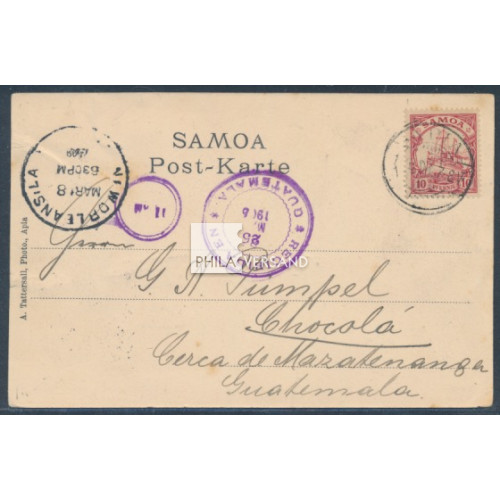 Yacht 1908 - Ansichtskarte mit hochinteressantem Motiv " Falealili-Str. " frankiert mit 10 Pfennig Yacht und entwertet in " Apia 13.2.08 " gesendet mit Kartentext nach Guatemala (Ankunftstempel), eine extrem seltene Kolonial-Destination, Karte in sehr guter Bedarfserhaltung mit nur geringen Beförderungsspuren