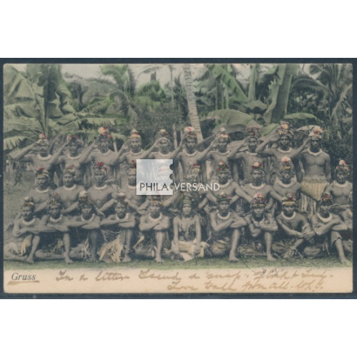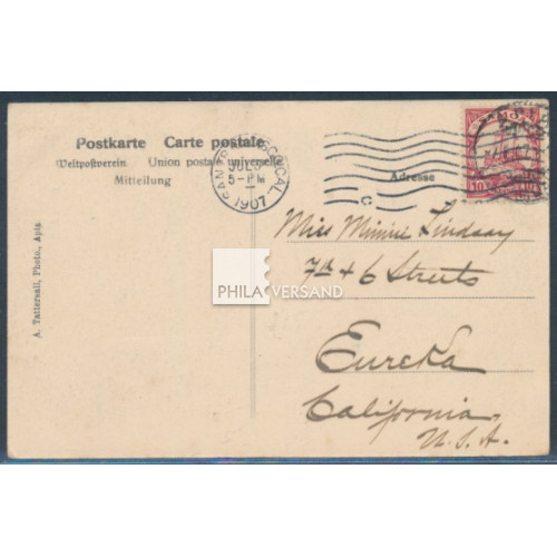 Yacht 1907 - farbige Litho-Ansichtskarte mit gutem Motiv " Gruss " frankiert mit 10 Pfennig Yacht und entwertet in " Apia 7.6.07 " gesendet mit Grußtext via San Francisco (Transitstempel) nach Eureka in Californien, ausgezeichnete Erhaltung und nahezu völlig ohne die sonst üblichen Beförderungsspuren