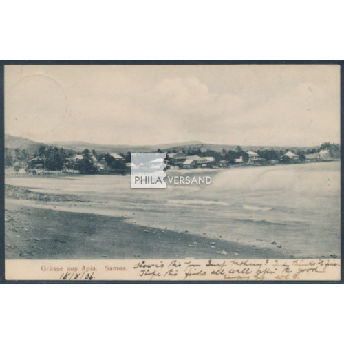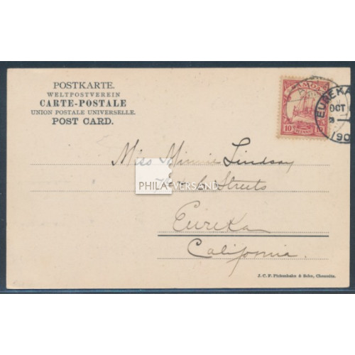 Yacht 1906 - Ansichtskarte mit tollem Panorama-Motiv " Grüsse aus Apia. Samoa " frankiert mit 10 Pfennig Yacht (Marke unten rechts minimal eckrund) und entwertet in " Apia 18.8.06 " gesendet mit Kartentext nach Eureka in den USA (Ankunftstempel teils auf der Frankatur), Karte in ausgezeichneter Erhaltung und nahezu völlig ohne die sonst üblichen Beförderungsspuren