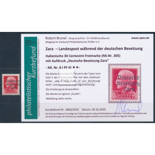 Aufdruck 1943 - 75 Centimes in Type I mit gutem Aufdruckfehler " oberer Bogen des B in Besetzung fehlt ", (lt. Michel 500 % Preisaufschlag!!), einwandfrei postfrisch und mit Befund Brunel, VPEV