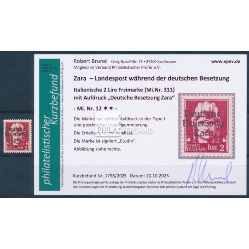 Aufdruck 1943 - 2 Lire einwandfrei postfrisch in Type I und mit Befund Brunel, VPEV