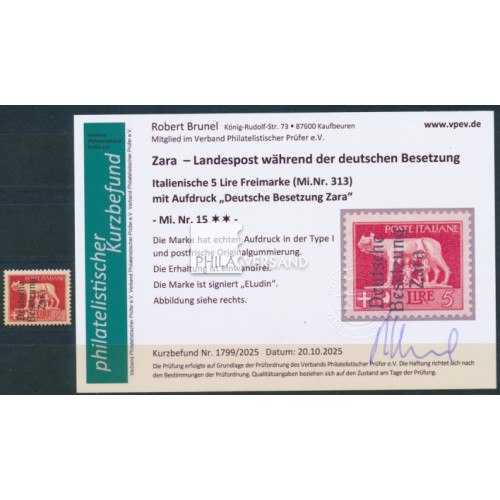 Aufdruck 1943 - 5 Lire einwandfrei postfrisch in Type I und mit Befund Brunel, VPEV