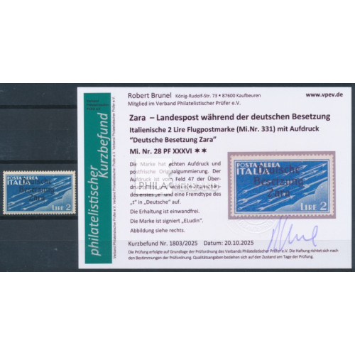 Aufdruck 1943 - 2 Lire Flugpostmarke mit seltenem Aufdruckfehler " abweichendes erstes e in Deutsche und Fremdtype des t in Deutsche ", einwandfrei postfrisch und mit Befund Brunel, VPEV