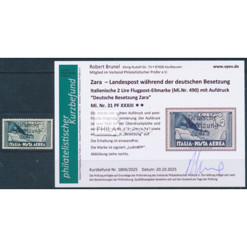 Aufdruck 1943 - 2 Lire Flugpost-Eilmarke mit seltenem Aufdruckfehler " schmales c in Deutsche und schmales g in Besetzung ", einwandfrei postfrisch und mit Befund Brunel, VPEV