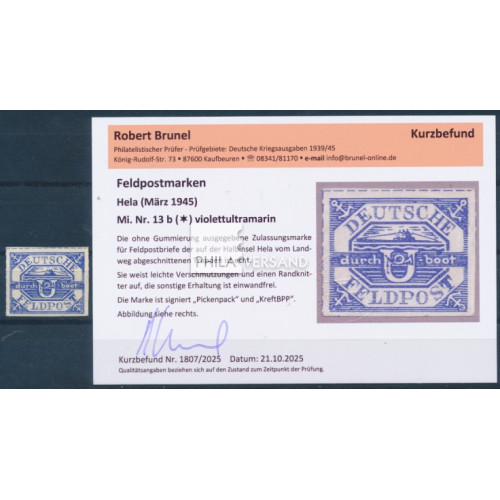 U-Boot Hela 1945 - wie verausgabt ungebrauchte Marke mit kleinem Randknitter, ansonsten in sehr guter Erhaltung und mit Befund Brunel