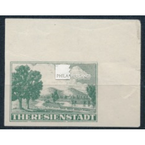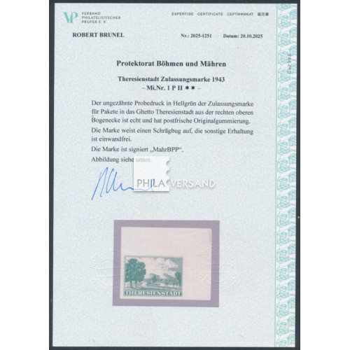Theresienstadt Probedruck 1943 - ungezähnte Marke in hellgrün als Probedruck aus der rechten oberen Bogenecke, einwandfrei postfrisch mit Schrägbug (siehe Rückseitenscan), ein in dieser Form sehr seltenes Angebot und mit Befund Brunel, VPEV