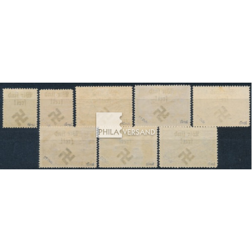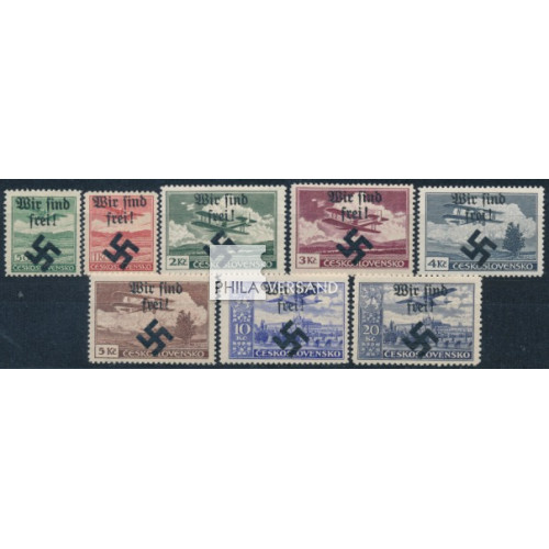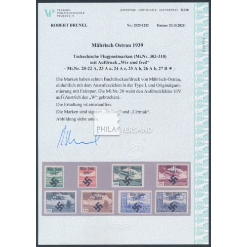 Mährisch-Ostrau 1939 - Flugzeug über Landschaften als höchst seltenes Angebot im kompletten Satz!!, dabei die Michel# 24 und 25 in guter Farbe sowie Michel# 20 mit besserem Aufdruckfehler " Anstrich des W von Wir gebrochen " (+ 100 % Michel), sehr sauber ungebraucht mit teils kaum erkennbaren Erstfalzspuren (teils nahezu postfrisch wirkend), ein Top-Angebot mit Attest Brunel, VPEV