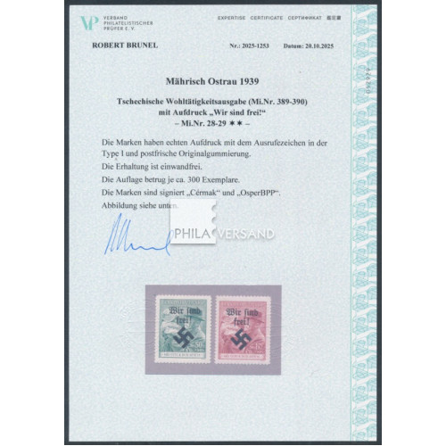 Mährisch-Ostrau 1939 - Masaryk mit Kind mit Aufdruck aus Mährisch-Ostrau in einwandfrei postfrischer Erhaltung und mit Expertise Brunel, VPEV