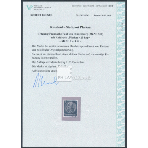 Hindenburg 1941 - 20 K auf 1 Pfennig mit schwarzem Handstempelaufdruck in einwandfrei postfrischer Erhaltung und mit Expertise Brunel, VPEV