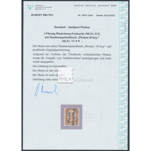 Hindenburg 1941 - 60 K auf 3 Pfennig mit schwarzem Handstempelaufdruck in einwandfrei postfrischer Erhaltung, eine exrem seltene Marke die vom Schalterverkauf zurückgezogen wurde, Expertise Brunel, VPEV