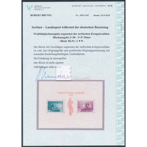 Kriegsinvaliden 1943 - Blocksusgabe in einwandfrei postfrisch Qualität und mit Expertise Brunel, VPEV