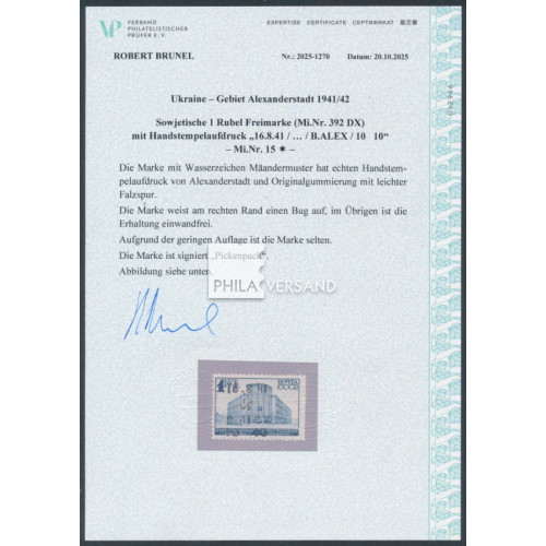 Handstempelaufdruck 1942 - 10 R auf 1 R mit Aufdruck, perfekte ungebrauchte Erhaltung mit kaum erkennbarer Erstfalzspur und ansonsten vollständiger Originalgummierung (Marke wirkt nahezu postfrisch), rechts ist die Marke bügig, ansonsten in ausgezeichneter Erhaltung und mit Expertise Brunel, VPEV