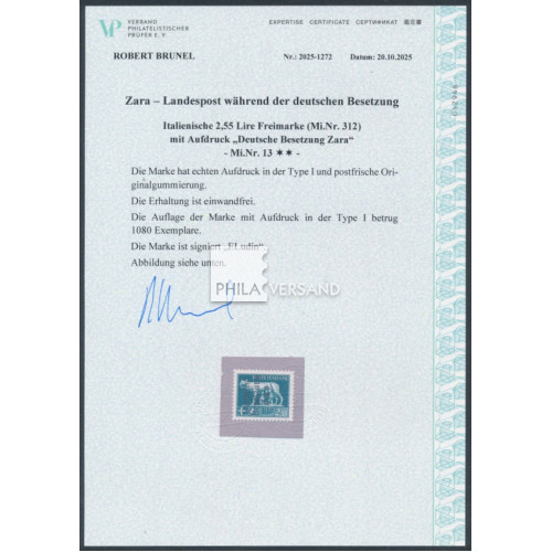 Aufdruck 1943 - 2,55 Lire einwandfrei postfrisch in Aufdrucktype I und mit Expertise Brunel, VPEV