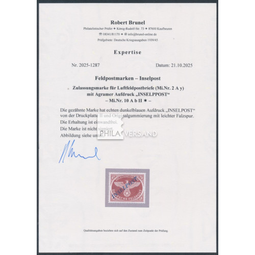 Agramer Aufdruck 1944 - sehr gut gezähnte Feldpostmarke mit Originalgummierung und kaum erkennbarer Erstfalzspur (Marke wirkt nahezu postfrisch) in besserer Aufdrucktype und mit Expertise Brunel