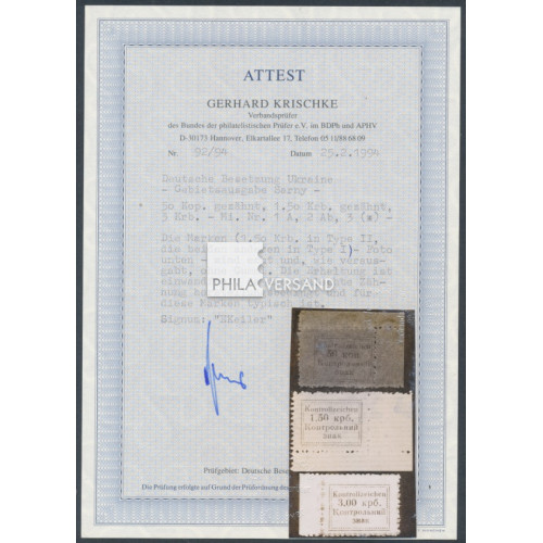 Gebiet Sarny 1941 - Freimarken im kompletten Satz, dabei die Michel# 2 in guter Type II (50 % Katalogwert!!), gezähnt und wie verausgabt ohne Gummierung in einwandfreier Erhaltung und mit Attest Krischke, BPP, Michel Spezial 2025 ohne Typenaufschlag 2800,- Euro, mit Typenaufschlag 2950,- Euro