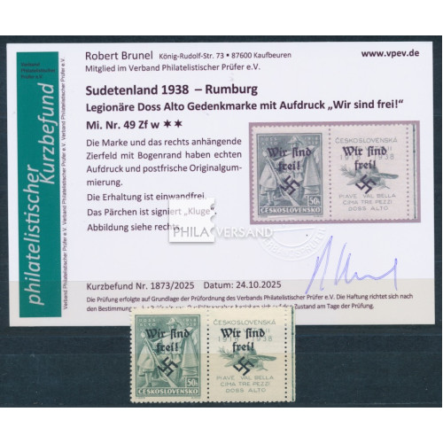 Rumburg 1938 - Doss Alto mit überdrucktem Zierfeld und Bogenrand rechts, einwandfrei postfrisch und mit Befund Brunel, VPEV