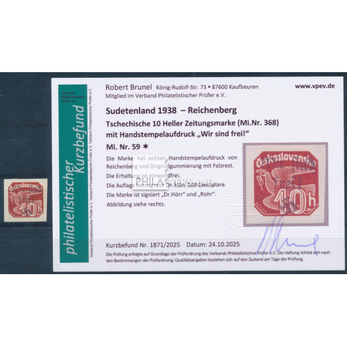 Reichenberg 1938 - 10 Heller Zeitungsmarke mit Aufdruck aus Reichenberg in ausgezeichneter ungebrauchter Erhaltung und mit Befund Brunel, VPEV