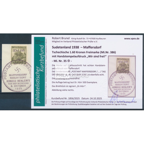 Maffersdorf 1938 - 1,60 Kronen Kuttenberg mit Aufdruck aus Maffersdorf auf kleinem Briefstück mit Sonderstempel, sehr gute gestempelte Erhaltung und mit Befund Brunel, VPEV