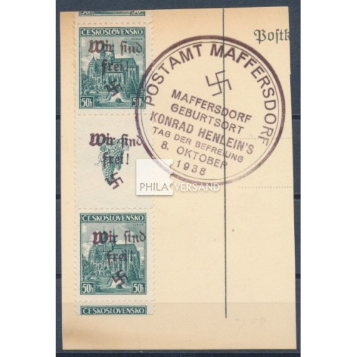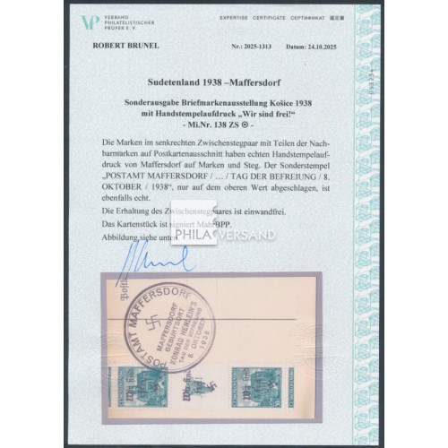 Maffersdorf 1938 - 50 Heller Ausstellung Kosice mit Aufdruck aus Maffersdorf im senkrechten Stegpaar in ausgezeichneter gestempelter Erhaltung auf Briefstück und mit Expertise Brunel, VPEV